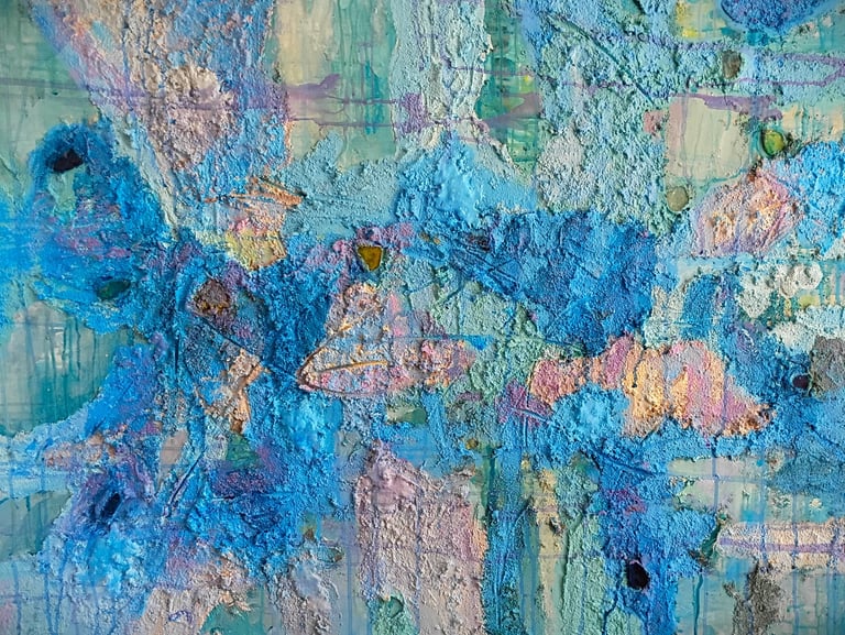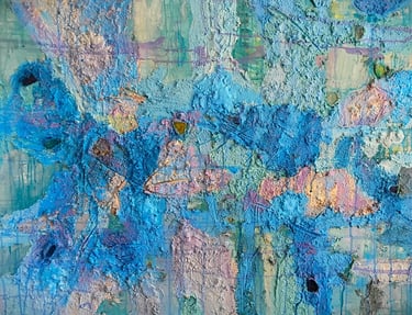 "Reef Series, Mixed Media on Canvas with Sea Glass ans Beach Sand, 36 x 36"